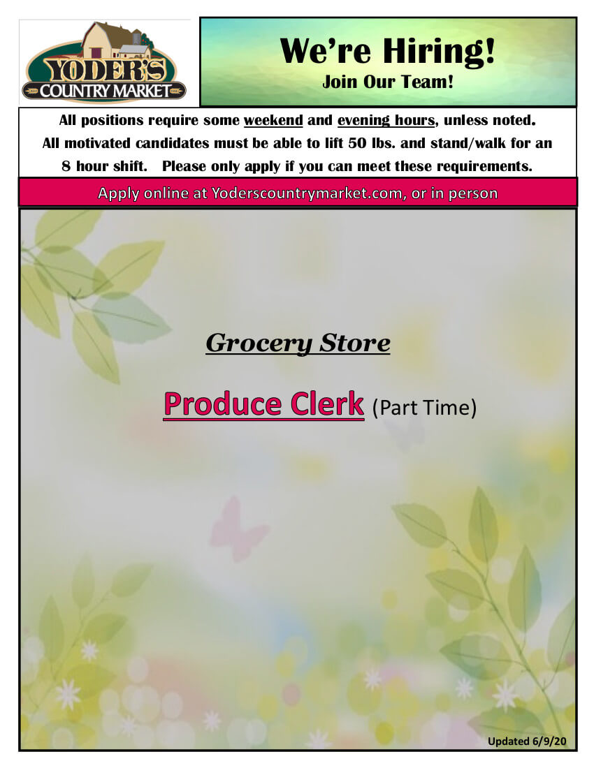 We are always looking for qualified, talented, and creative individuals to join our Team at Yoder’s Country Market in our Grocery Store, Pharmacy, Restaurant & Buffet, Gift / Craft Shop, Petal Perfect Flower Shop, and Fuel Island. If any of the open positions below interest you, please feel free to complete our online application below or come into our Grocery Store and complete a paper application. Employees receive generous discounts. Employees receive a 10% discount in the grocery store and a 20% discount in the restaurant. Incentive programs are also available for employees to participate in and they may win prizes and gift cards. Compensation is an hourly wage that is paid weekly. Compensation is competitive and depends on experience.